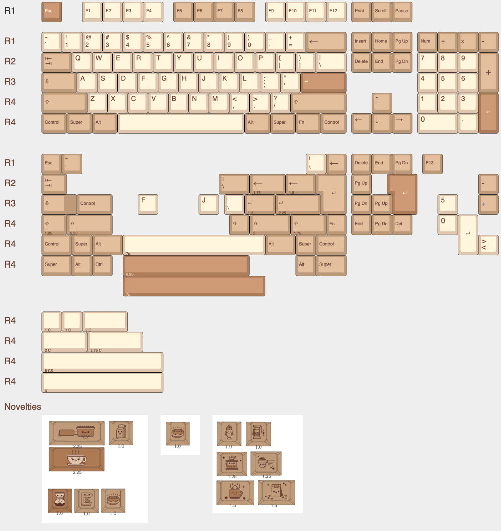 | Thickness | Works with MX-style switches (switches that have cross-stem). Compatible with standard ANSI layouts as well as ISO. Please see the layout image for all keycap sizes. |